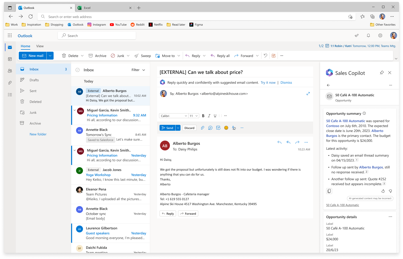 We're excited to reveal the new integrations of Copilot's capabilities with your work data, enabling direct interaction within Outlook, voice activation in Excel via the Microphone feature, and enhanced Copilot responses in Loop.